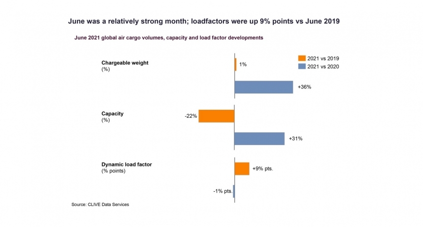 Based on analyses of both the volume and weight perspectives of cargo flown and capacity available, CLIVE’s dynamic load factor for June was 9 percent points up versus 2019, and 1 percent points down versus June 2020.