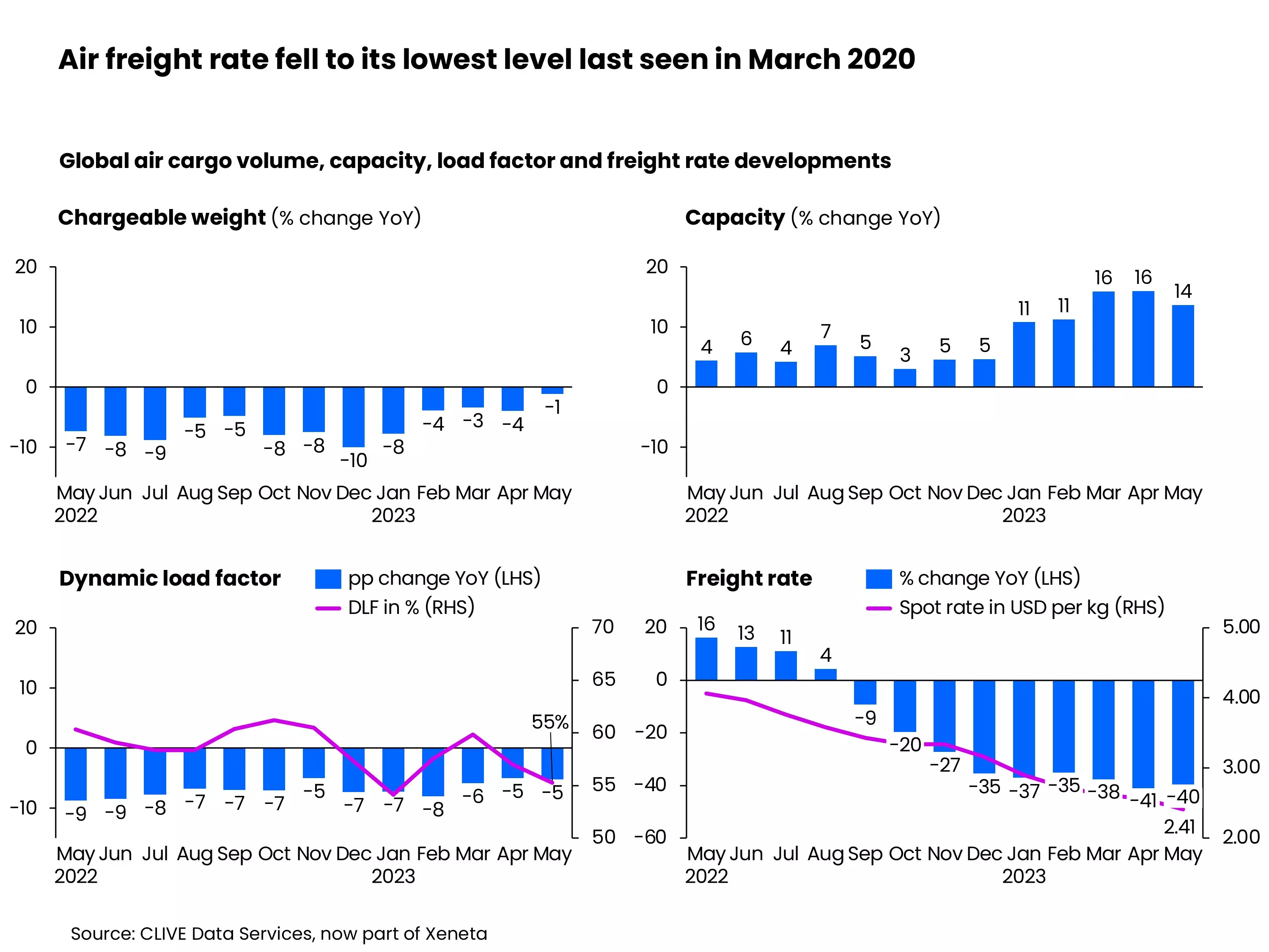 The global airfreight spot rate fell 40 percent in May from a year earlier, reaching its lowest level in over three years of $2.41 per kg, just days after IATA predicted airline cargo revenues and yields could fall by more than 31 and 29 percent respectively in 2023.