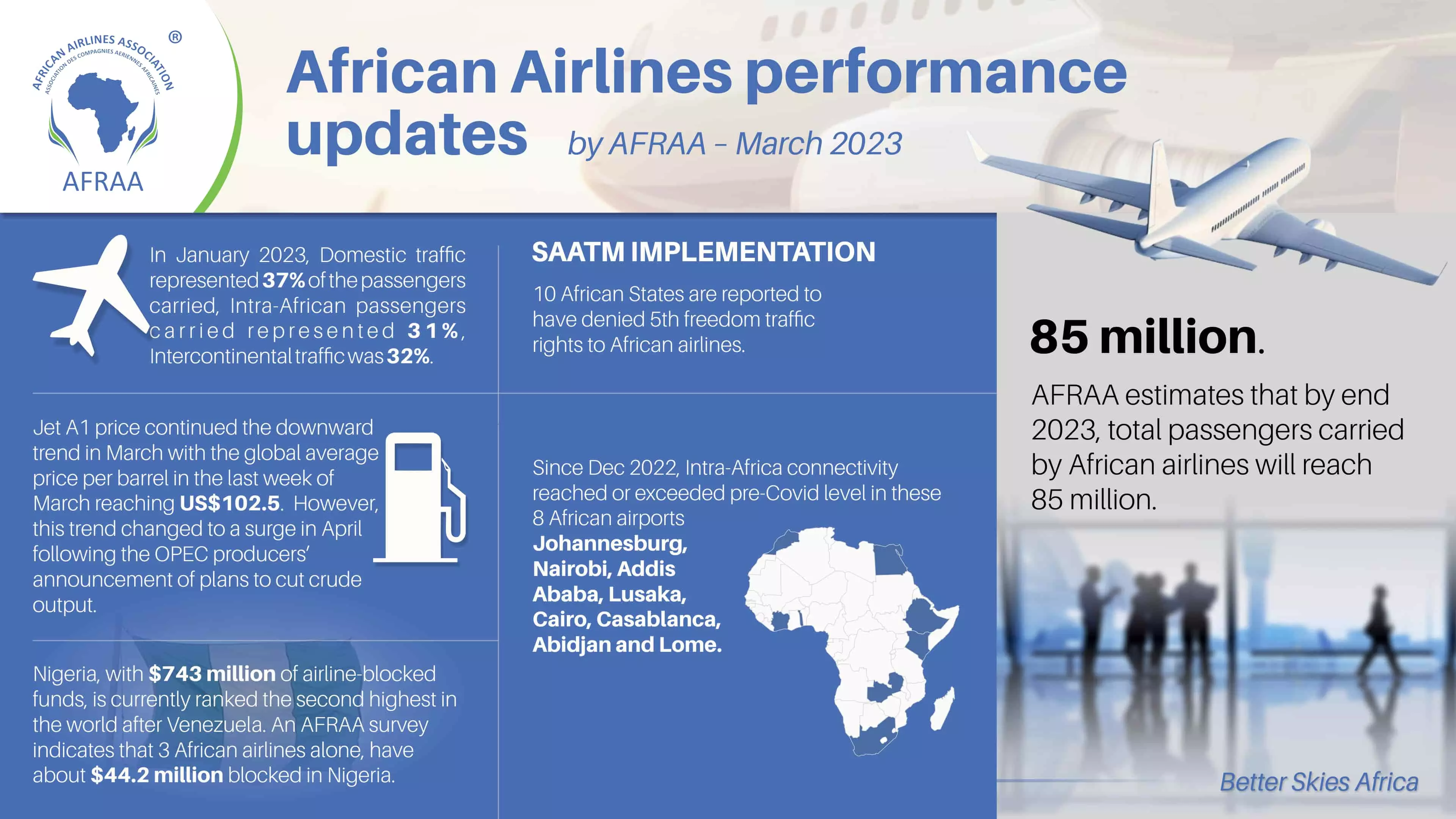 In March, the traffic carried by African airlines reached 95 percent of the full year 2019 level. Domestic market share was at 37 percent, intra-Africa at 31 percent and intercontinental at 32 percent. AFRAA estimates that by end 2023, total passengers carried by African airlines will reach 85 million, this being about 10 million short of the full year 2019 passenger traffic.