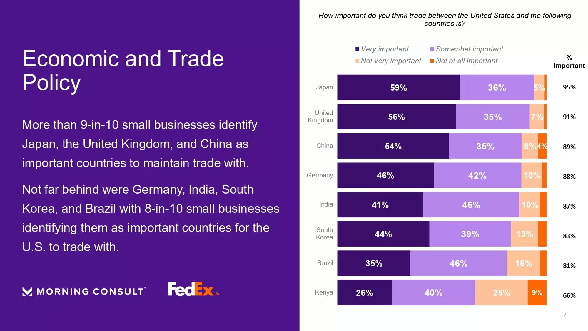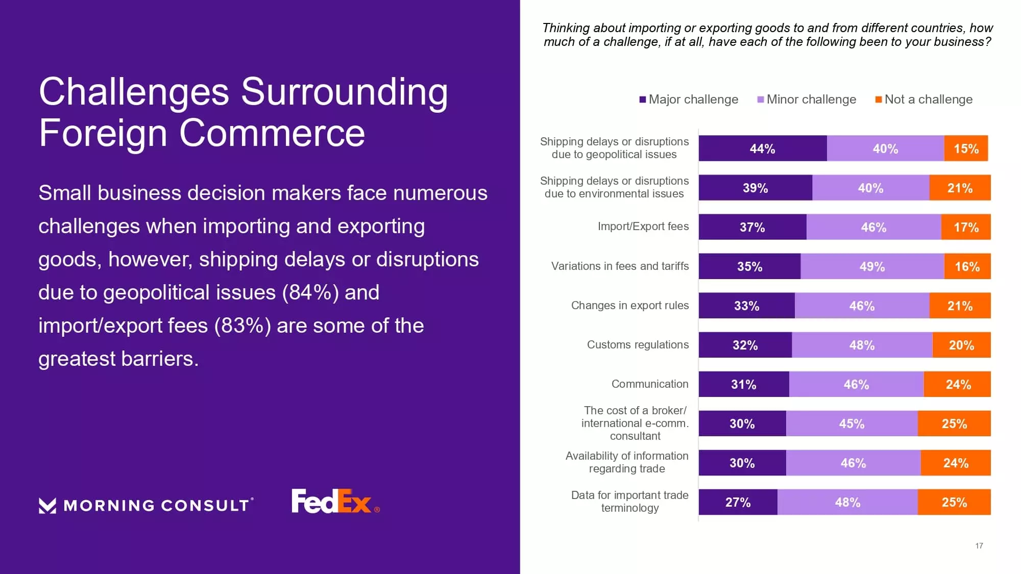 The Small Business Trade Index, released by FedEx, is based on a survey of SMB leaders conducted by Morning Consult between February 14 and 24, 2024. "The poll was conducted among small business decision makers, which are defined as those who work for companies with less than 500 employees and hold a position of manager or higher. 1,007 SMB decision makers were interviewed in the U.S. Results from the full survey have a margin of error of plus or minus three percentage points."