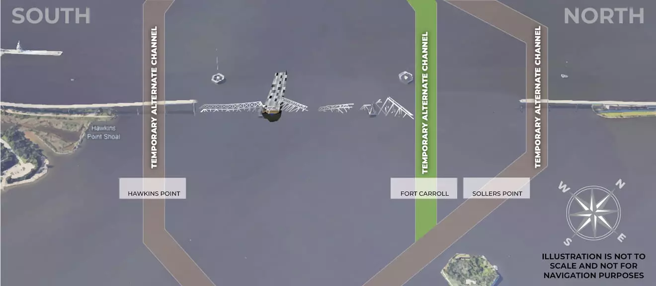 The Captain of the Port established the Fort Carroll Temporary Alternate Channel, which is on the northeast side of the main channel in the vicinity of the Francis Scott Key Bridge and will provide limited access for commercially essential vessels.