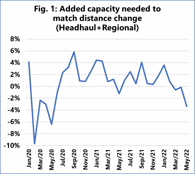 "However, the developments into 2022 have shifted to become negative, and in May 2022 we now see a distance impact where there is now a reduced need for vessel capacity of 3.4 percent as a consequence of shortening distances (Figure 1)," says an update from Sea-Intelligence.