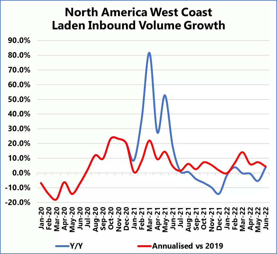 The year-on-year change of container handling for the major North America West Coast ports (Los Angeles/Long Beach, Oakland, Prince Rupert, Vancouver, and Seattle/Tacoma) has been negative in four out of the first six months of 2022 while there was a 4 percent increase in June 2022.
