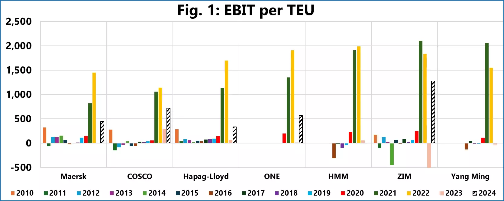 Of the nine reporting carriers, eight have reported an EBIT of over $1 billion, of which three have reported EBIT of over $2 billion, the update added. "COSCO had the highest Q32024 EBIT of $4.71 billion. Even with the highest EBIT, COSCO did not have the highest EBIT/TEU as they also grew their global volumes by 10.8 percent (Fig 1). Their EBIT/TEU of $716/TEU was surpassed by ZIM’s EBIT/TEU of $1,273/TEU. COSCO was followed by ONE ($567/TEU) and Maersk ($446/TEU)."