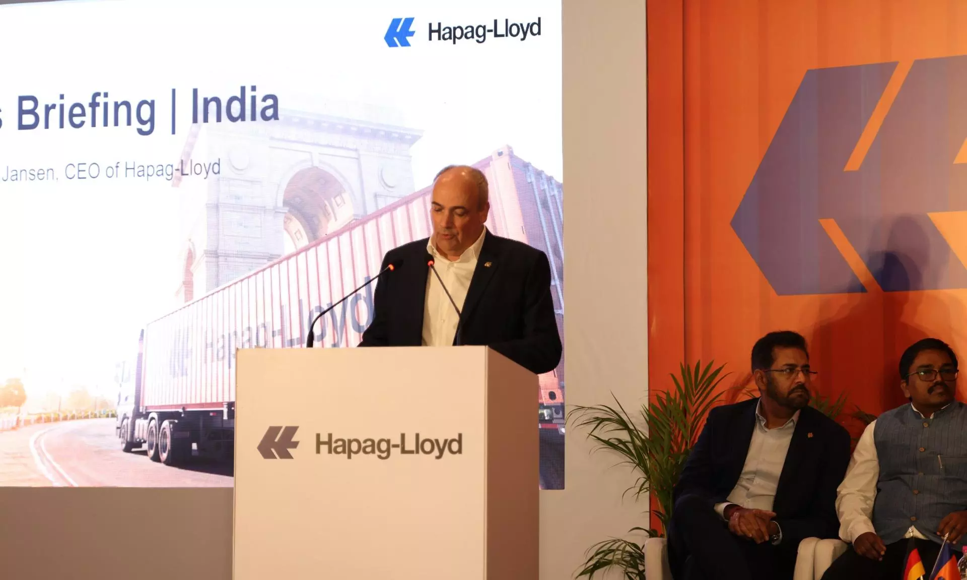Hapag-Lloyd Chief Executive Officer Rolf Habben Jansen addressing a press meet in Mumbai on March 19, 2026