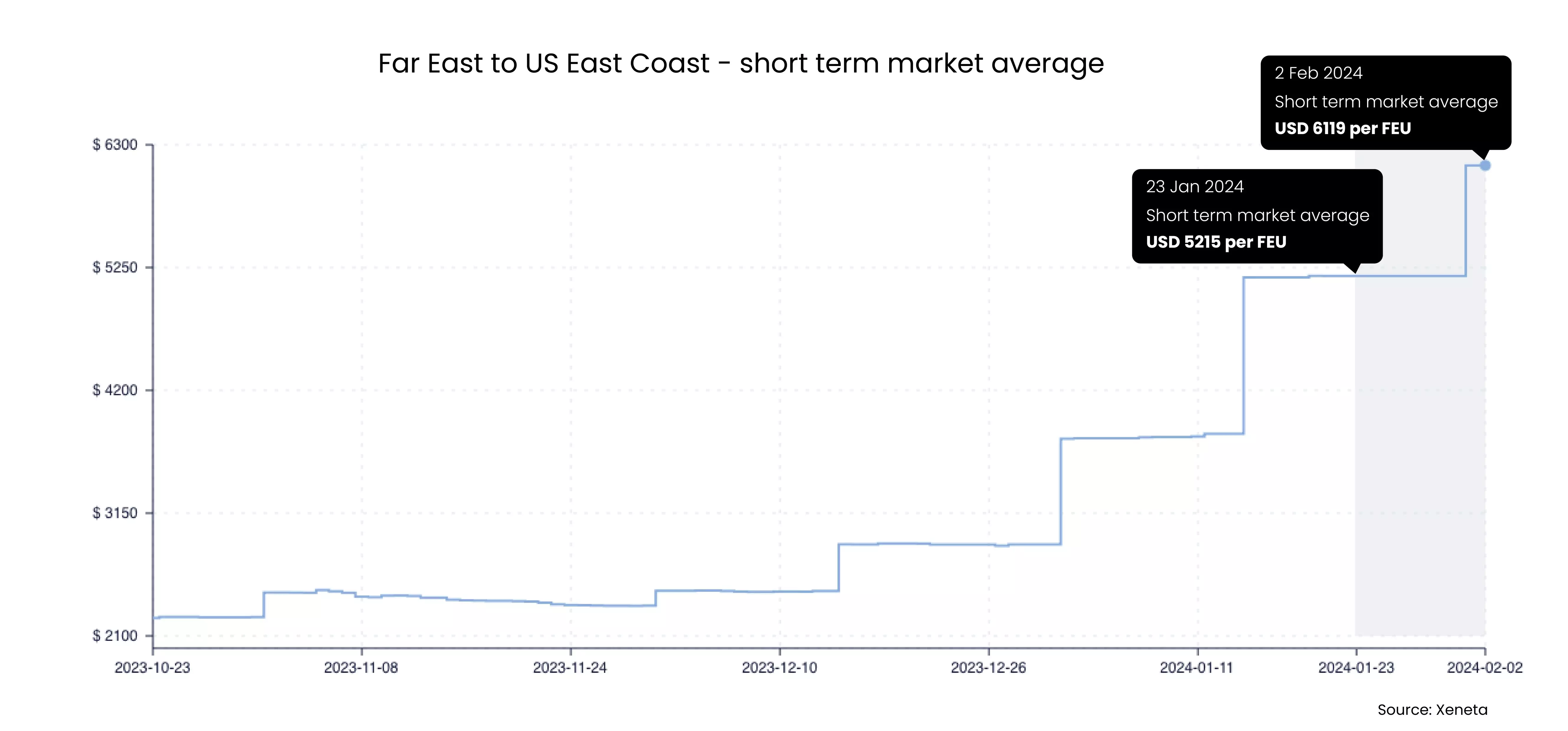 "Rates from the Far East to North Europe are set to rise by 8 percent by February 2 with a market average of $5,106 per FEU. This is an increase of 235 percent since mid-December."