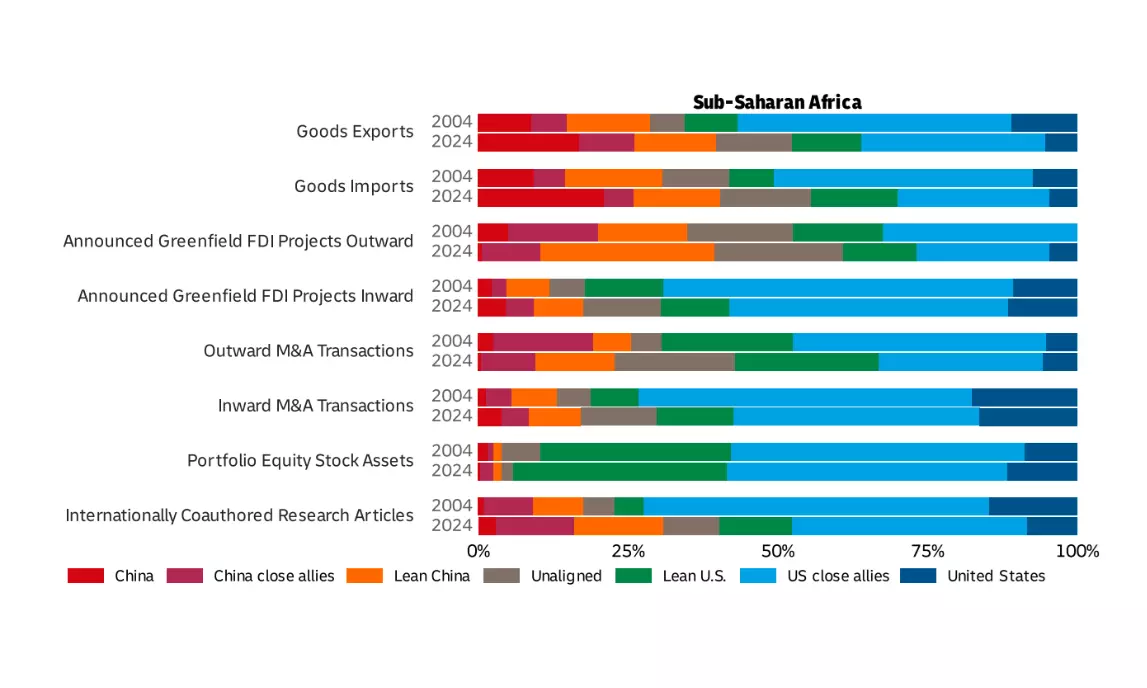 Sub-Saharan Africa summary profile of international flows by geopolitical alignment. Sources: Capital Economics; Clarivate Web of Science; Financial Times fDi Markets database; IMF CPIS database; IMF DOT Database; SDC Platinum